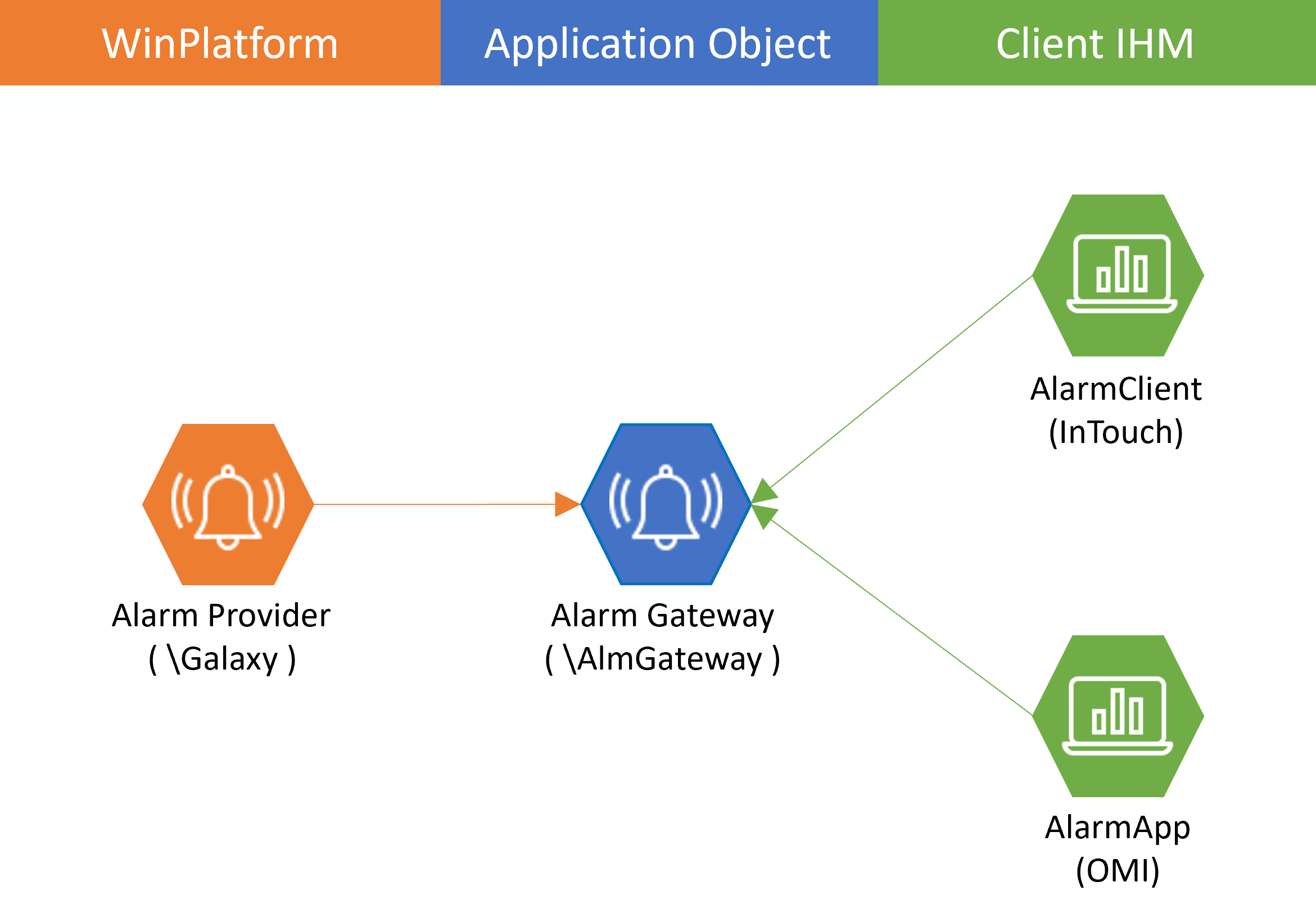L'affichage des alarmes se fait en standard par l'AlarmClient (InTouch) ou l'Alarm App (OMI)