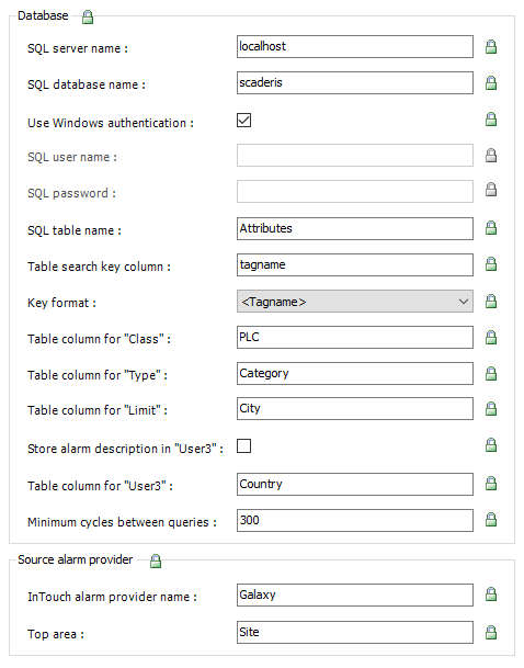 Les attributs supplémentaires des alarmes sont configurés dans une table d'une base de données SQL Server.