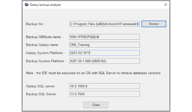 Cette fonction permet d'analyser un backup de Galaxy (fichier .CAB) pour savoir avec quelle version d'Aveva System Platform il a été créé et quelle version de SQL Server il nécessite.