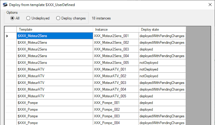 Il est possible d'appliquer l'action à toutes les instances, seulement aux instances modifiées, ou seulement les instances non déployées.