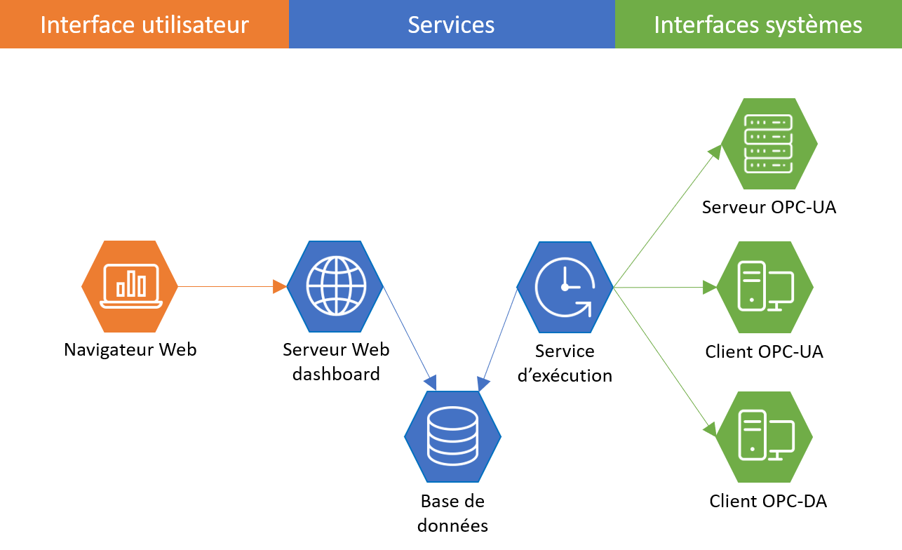 Le logiciel peut s’interfacer avec une supervision ou directement avec des équipements. Il peut s’y connecter en OPC-UA ou OPC-DA, ou mettre à disposition un serveur OPC-UA interne.