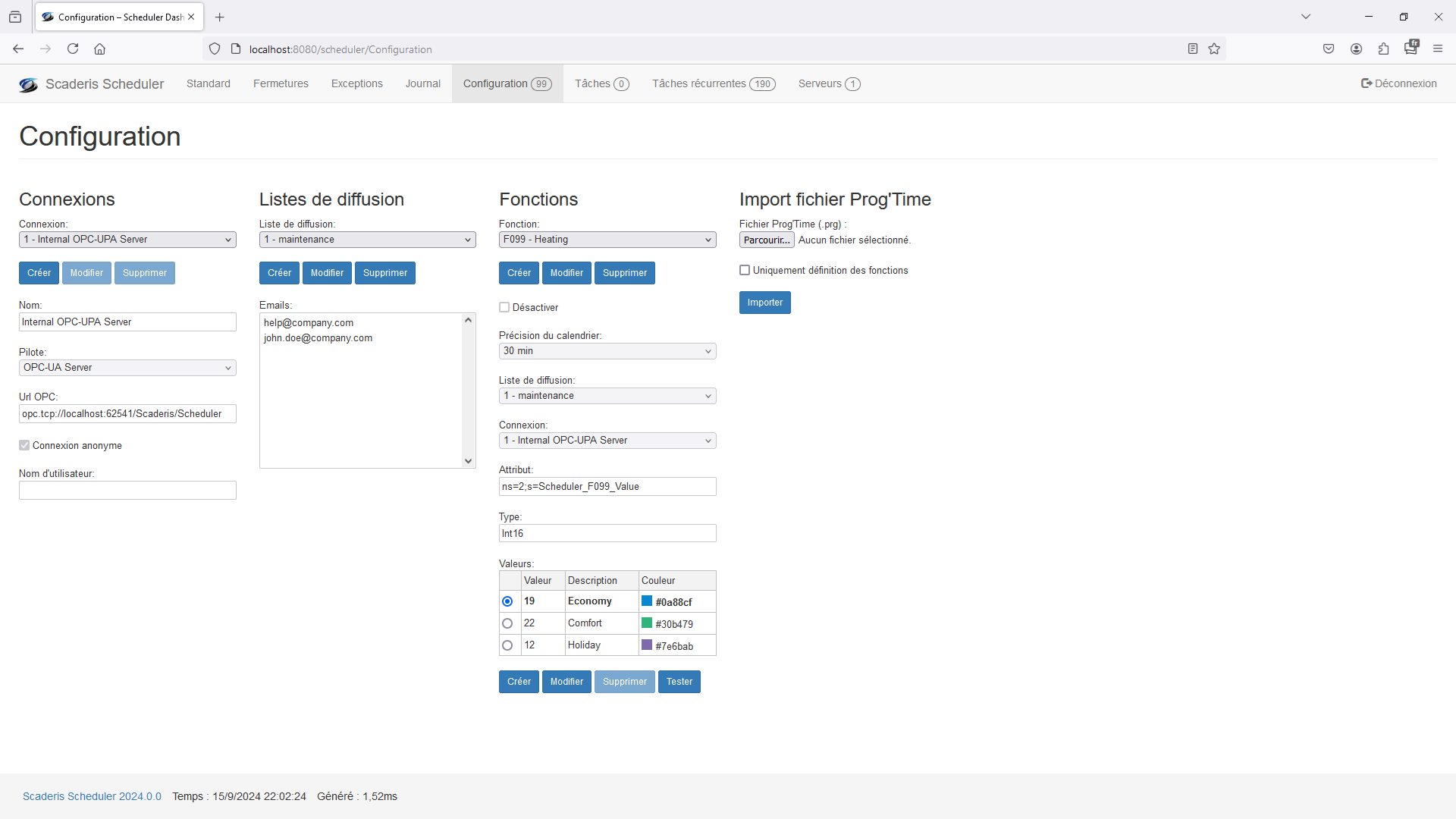 SCADERIS Scheduler permet de configurer des listes de diffusion email. Une liste de diffusion peut être configurée pour chaque fonction.