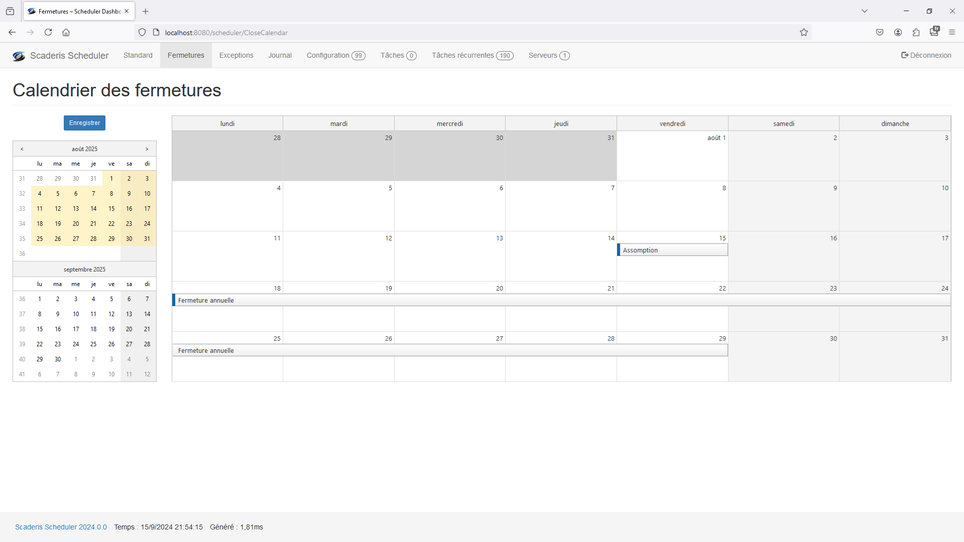 Le calendrier des fermetures permet de configurer les dates de fermeture (jours fériés, fermeture annuelle…) dans un calendrier infini. Une description est associée à chaque fermeture.