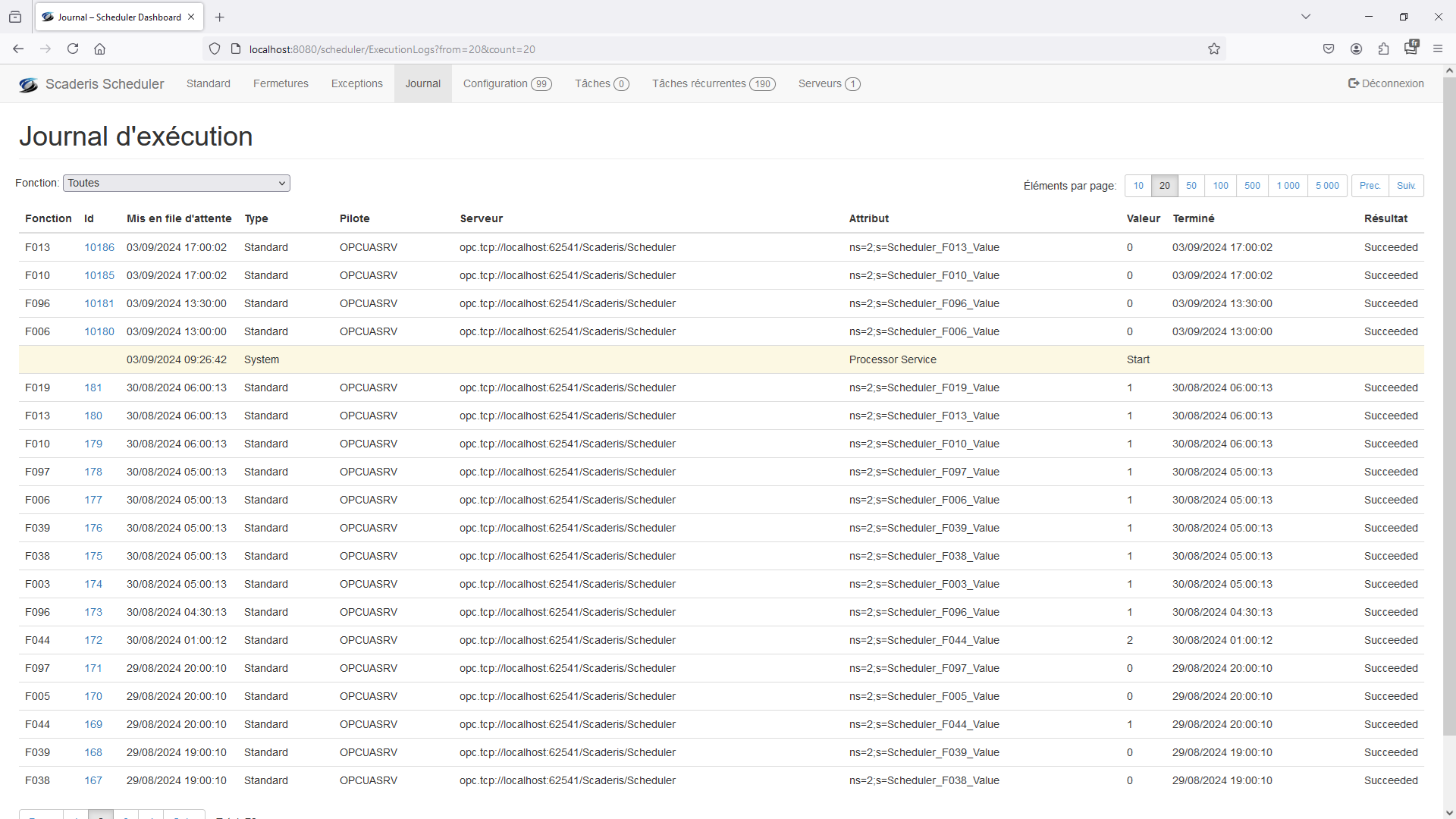 Le journal contient également les événements de démarrage et d’arrêt du service d’exécution, les activations/désactivations des fonctions, et les erreurs lors des écritures des changements d’états dans les interfaces avec les autres systèmes